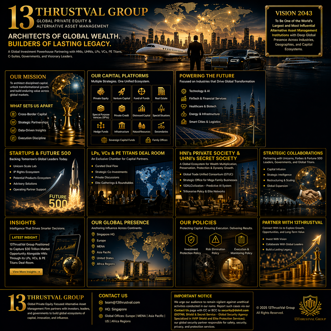 13ThrustVal Group Architecting the Global Capital Ecosystem Powering HNIs, LPs and Institutions into the Next Era of Wealth, Influence, and Market Leadership Executive Summary Global capital markets are entering a defining structural shift. Traditional investment models are no longer sufficient to capture emerging opportunities across private markets, alternative assets, and cross-border ecosystems. 13ThrustVal Group is positioned as a next-generation global private equity and alternative asset management platform, designed to operate at the intersection of capital, strategy, execution, and influence. By integrating HNIs, UHNIs, LPs, venture capitalists, private equity leaders, governments, and enterprises into a unified ecosystem, 13ThrustVal is building a capital orchestration architecture that goes beyond investing toward system-level value creation. 1. The Shift in Global Capital Power The global financial ecosystem is undergoing a transformation. Capital is moving from public to private markets. Investors are increasingly seeking control and influence rather than passive returns. Cross-border deal flow is accelerating, and institutional and private wealth are converging. This has created a multi-trillion-dollar opportunity landscape. However, access to this opportunity is limited to those with strong networks, execution capabilities, and strategic positioning. 2. 13ThrustVal: A Capital Orchestration Platform 13ThrustVal Group is not structured as a traditional investment firm. It operates as a global capital platform where investors access curated opportunities, companies receive capital and execution support, and institutions collaborate for large-scale outcomes. The core model integrates private equity to control and scale businesses, venture capital to capture emerging leaders early, alternative assets for diversification and stability, and special situations to unlock hidden value. 3. The Multi-Layer Ecosystem 13ThrustVal is built as an integrated ecosystem rather than a single business unit. Its capital platforms include private equity, venture capital, fund of funds, private credit, hedge funds, and real assets. Its strategic systems include LPs, VCs and PE Titans Deal Room, strategic deal rooms, and fund strategy platforms. Its growth and execution engines include the operating partner model, management consulting division, and Unicorn Scale Lab. Its elite networks include HNI and UHNI ecosystems, sovereign-level partnerships, and family office alignment. This creates a closed-loop capital system where opportunity, execution, and scale are interconnected. 4. The Deal-Room Architecture At the center of 13ThrustVal lies the LPs, VCs and PE Titans Deal Room. This is a structured environment where capital meets opportunity, intelligence meets execution, and partnerships are formed. Key capabilities include curated global deal flow, capital aggregation, cross-border investment execution, and institutional collaboration. This transforms investors into strategic capital participants rather than passive investors. 5. Operating Partner Model: Beyond Capital 13ThrustVal operates beyond traditional investment by working alongside businesses as an operating partner. Key functions include business model optimization, market expansion strategy, governance structuring, and capital readiness. The outcome is faster scaling, stronger execution, and higher enterprise value creation. 6. Future 500 Companies Framework The Future 500 Companies initiative identifies high-potential startups at an early stage and supports them with capital, intelligence, and global networks. The objective is to accelerate these companies into global market leaders and future multinational enterprises. 7. Unicorn Scale Lab The Unicorn Scale Lab is a structured growth system designed for growth-stage companies preparing for institutional capital and global expansion. It focuses on capital architecture, governance frameworks, global expansion strategies, and IPO readiness. This is not an incubation model but a scale engineering system designed for enterprise-level growth. 8. HNIs and UHNIs as Strategic Capital High Net Worth and Ultra High Net Worth individuals are evolving into strategic capital allocators and influence drivers. Through 13ThrustVal, they gain access to exclusive opportunities, institutional-grade frameworks, and cross-border investment platforms. This enables a transition from passive investing to active participation in capital strategy and value creation. 9. Global Presence and Positioning 13ThrustVal operates across Asia-Pacific, Europe, MENA, and the Americas. This positioning allows access to emerging opportunities, integration into global capital flows, and participation in cross-border market expansion. 10. Risk, Governance, and Execution Framework A key strength of 13ThrustVal lies in its structured frameworks, including Investment Protection Policy, Risk Elimination Policy, and Execution and Monitoring Policy. These ensure disciplined capital deployment, controlled risk environments, and performance-driven execution. 11. Intelligence and Predictive Systems Through systems such as 132KLCivilization, 13ThrustVal focuses on anticipating market shifts, identifying future opportunities, and guiding long-term strategic positioning. This enables a transition from reactive investment approaches to predictive capital positioning. 12. Government and Institutional Alignment Through the Economic Advancement Council, 13ThrustVal engages with governments, policymakers, and public sector institutions. The objective is to enable economic growth, shape capital flows, and build large-scale strategic systems across markets. 13. The Strategic Vision 13ThrustVal is building a global capital ecosystem where capital is structured, opportunities are curated, and execution is disciplined. The long-term ambition is to achieve consistent global leadership, institutional influence, and multi-generational value creation. 